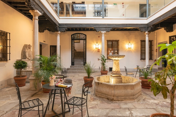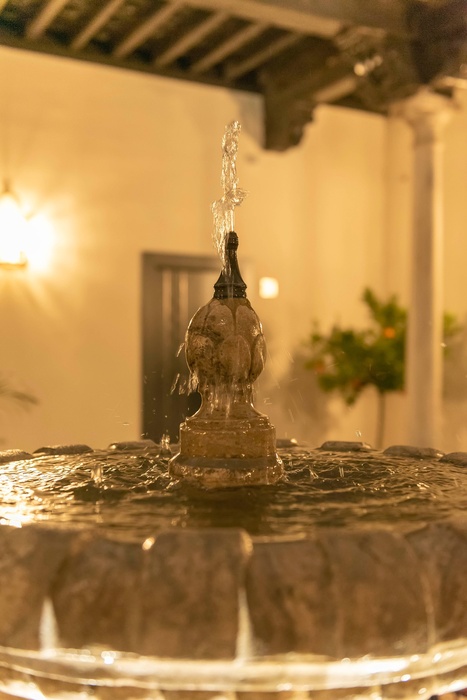In the courtyard, during the day, natural light and the murmur of water from the fountains create a unique space inviting you to rest and relax; at dusk, its artistic lighting highlights its charms, making this spot a magical place.